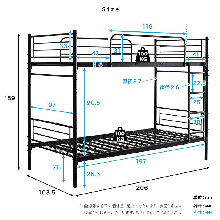 並べて連結もできる パイプ 2段ベッド 連結してキングベッド ブラック ホワイト