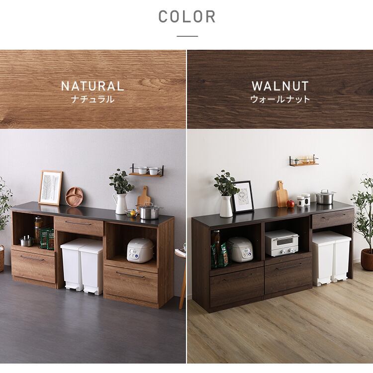 日本製 特殊鋼板を使った組み合わせキッチンカウンター 180cm オープン収納+オープン収納+ゴミ箱上カウンター