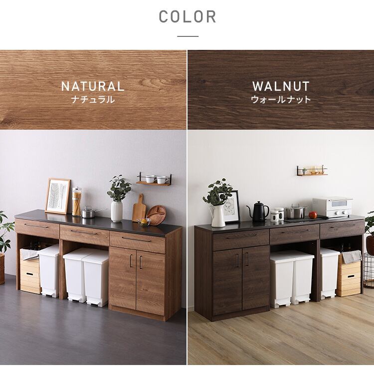 日本製 特殊鋼板を使った組み合わせキッチンカウンター 180cm ゴミ箱上カウンター+ゴミ箱上カウンター+扉収納
