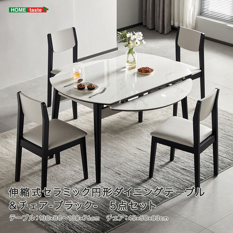 伸縮式セラミック円形ダイニングテーブル&チェア-ブラック- 5点セット