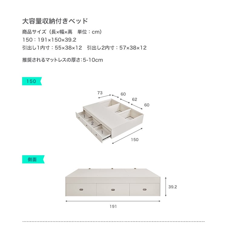 ホワイト 大容量収納付きベッド 150cm ダブル