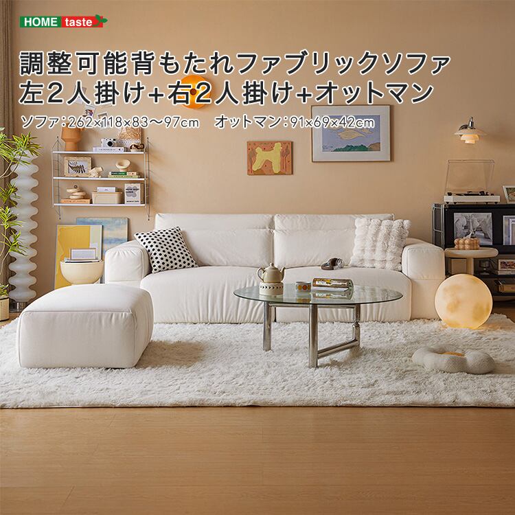 調整可能背もたれファブリックソファ 左2人掛け+右2人掛け+オットマン