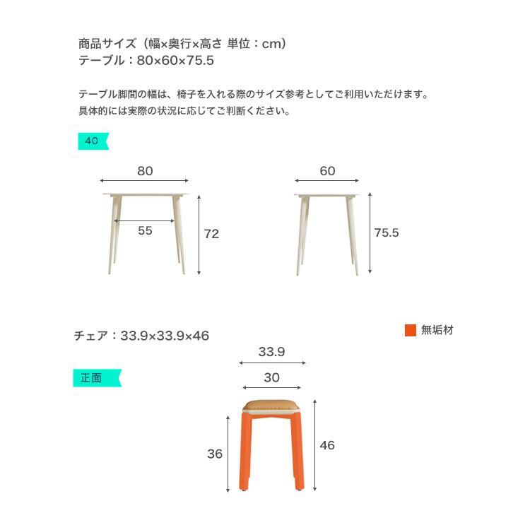 テーブル:80cm×60cm×75.5cm、チェア:33.9cm×33.9cm×46cm