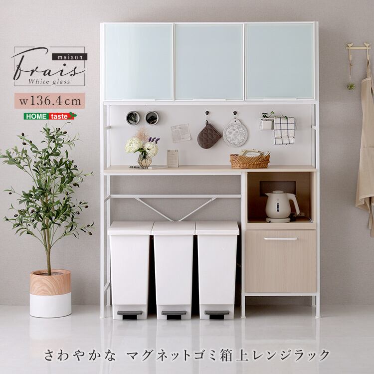 さわやかなマグネットゴミ箱上レンジラック ホワイトガラス【Frais-フレ-】