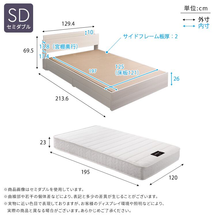 【商品サイズ】ベッドSD:(約)幅129.4×奥行213.6×高さ69.5cm