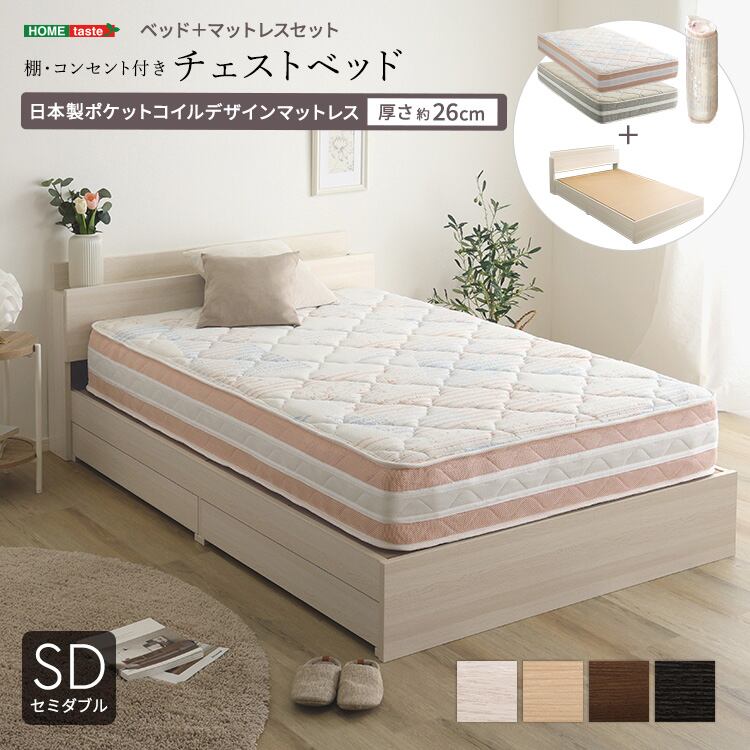棚・コンセント付きチェストベッド 日本製ポケットコイルデザインマットレスセット(セミダブル)
