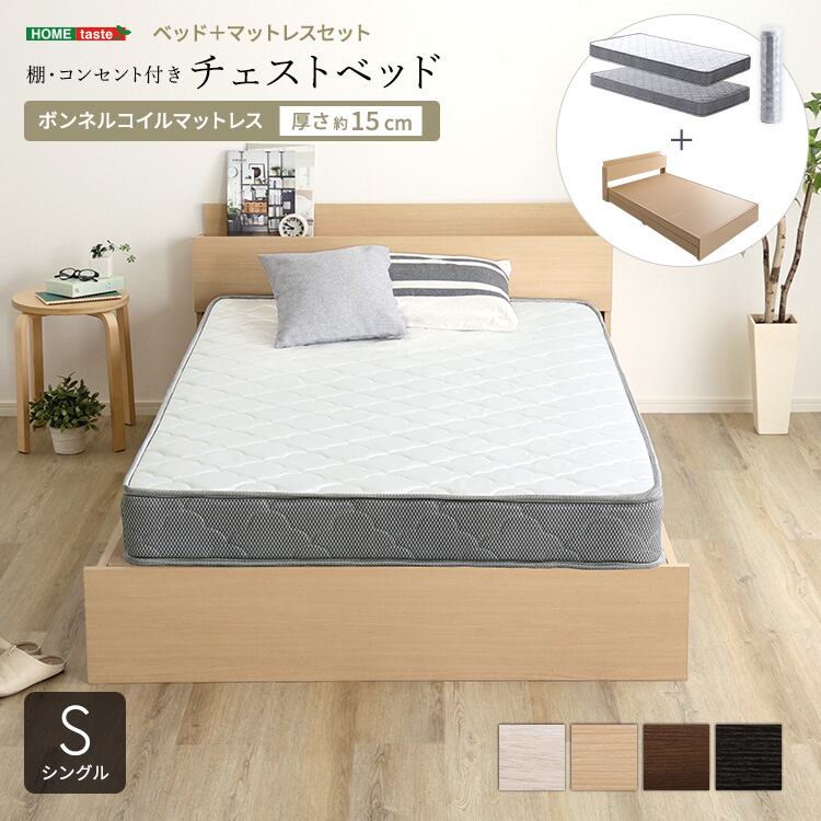 棚・コンセント付きチェストベッド ボンネルコイルマットレスセット(シングル)