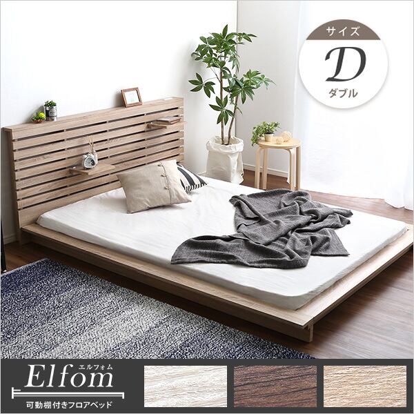 可動棚付きフロアベッド(ダブル)ベッドフレーム、ロースタイル、スリムヘッドボード|Elfom エルフォム