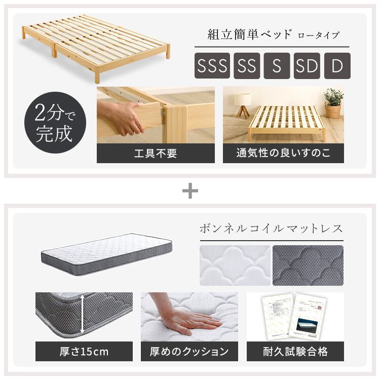 2分で完成!組立簡単ベッド ボンネルコイルマットレスセット(セミシングル)