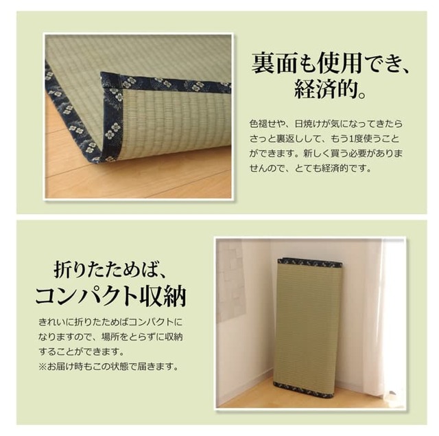 上敷きを敷くだけで畳のお部屋をリフレッシュ出来ます。日焼けしてしまった畳のリフレッシュに、新品の畳を汚さないためのカバーにご使用下さい。長さ120cm以上の長い国産(九州産)い草を使用しています。そのうち約95cmを使用しています。ヘリ際の白い部分が少ない、長いイ草を使用した高級な商品です。(白い部分は日焼けではありません、い草の根元と先端部分の色です。)い草は長いものほど高級になります。い草は先端部分が赤茶色く、根元が白く真中が青(緑)色です。真中の良質な青の部分を多く使用するほど、丈夫で綺麗な仕上がりとなります。またイ草は使用するうちに日焼けをしますが、真中の青の部分を多く使用したものほど、全体が綺麗にムラなく日焼けし、味が出ます。こちらの商品は畳表と同じ織り方の糸引織で仕上げました。双目織りと比べて、い草の打ち込み本数が多いため丈夫です。表面が滑らかなので、ホコリなどがたまりにくいのが特徴です。長くご使用されたい方や、耐久性をお求めの方には糸引織をおすすめします。国産(九州産)のい草を使用しています。国産い草は一本一本が太く、表皮が厚く繊維がキメ細かいので弾力性があり、耐久性に優れています。い草には空気の清浄化作用、湿度の調節作用があり、汚れにくいといった特徴があります。い草に青森ヒバ加工を施しています。(抗菌、防臭効果)表裏の両面が使えて経済的です。