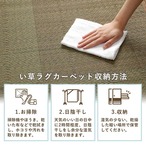 い草カーペットは和室の畳をカバーし、汚れや傷を防止してくれます。通常のカーペットと違い毛足が無いのでゴミや髪の毛などがからみにくく、掃除機やコロコロ(粘着シート)での掃除がラクにできます。い草には優れた消臭機能があり、汗臭やペット臭などの原因となる物質を消臭してくれます。い草には喘息の原因の一つとも言われる二酸化窒素や、シックハウス症候群の原因の一つのホルムアルデヒドを吸着してくれます。天然物質としては抗菌力の高い青森ヒバから抽出したヒノキチオールをい草生地に使用しており、抗菌防臭効果があります。い草の癒される香りとサラッとした肌触りはそのままに、和室や洋室にも合わせられるインテリア性の高いナチュラルシンプルなデザインで仕上げています。