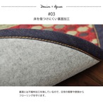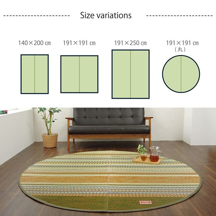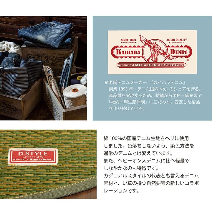 広島県福山市のデニム生地メーカー、カイハラ株式会社の生地をヘリで使いました。イ草生地は袋織りという技法で繊細な柄を出しています。折れ曲がりが複雑なので長いイ草を使用しないと切れてしまいます。縦糸が密なので、しっかりとして破れにくいのが特徴です。国産(九州産)のい草を使用しています。一本一本が太く、表皮が厚く繊維がキメ細かいので弾力性があり、耐久性に優れています。い草には空気の自然浄化作用、湿度の調節作用などがあります。裏にはフローリングを傷つけにくいよう、不織布を貼っています。い草に青森ヒバ加工を施しています。(抗菌、防臭効果)