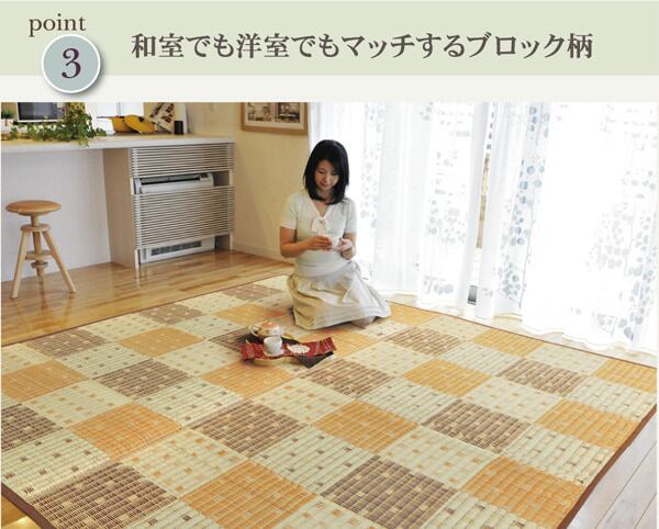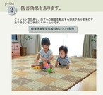 クッション性を追求したボリュームタイプ(メーカー比約3倍)のカーペットです。裏地にはソフトテックというポリエステル素材を使用しています。ポリエステル繊維を、メーカーが新たに開発した独自の技術で圧縮し、通気性を保ちつつ、圧倒的なクッション性をのある素材に仕上げました。軽量床衝撃音低減性能LL(1)-8を取得しており、床下への騒音を軽減する効果もあります。国産(九州産)のい草を使用しています。一本一本が太く、表皮が厚く繊維がキメ細かいので弾力性があり、耐久性に優れています。い草には空気の自然浄化作用、湿度の調節作用などがあります。また汚れにくく、使用するうちに黄金色に変化し味が出ます。い草に青森ヒバ加工を施しています。(抗菌、防臭効果)