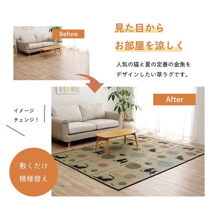 人気の猫と夏の定番の金魚をデザインしたい草ラグです。コンパクトに三つ折りで畳めて省スペースにも収納できます。い草には空気の自然浄化作用、湿度の調節作用などがあります。い草にヒバエッセンス加工を施しています(抗菌防臭効果)。青森県のヒバの木から抽出した「ヒバ油」をメーカー独自の技術で商品に加工しました。「ヒバ油」には、ヒノキチオールという天然物質としては極めて抗菌性の高い成分が含まれ、医療や食品など多分野で利用研究が進められています。裏は滑り止め不織布付きで、滑る心配がありません。