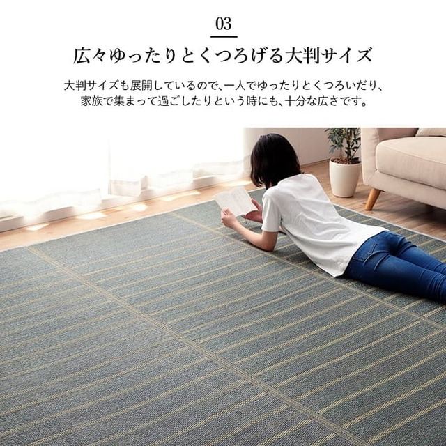 どのようなテイストのお部屋にも合わせやすい、シンプルなデザインのい草ラグです。
