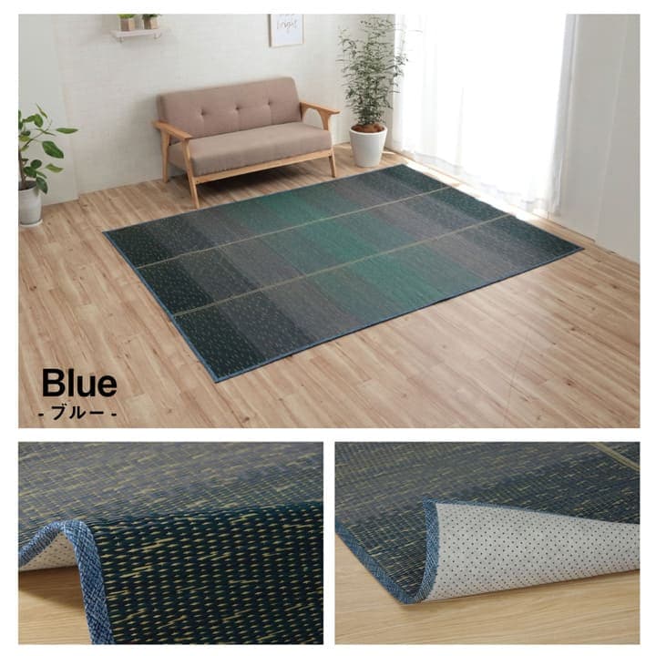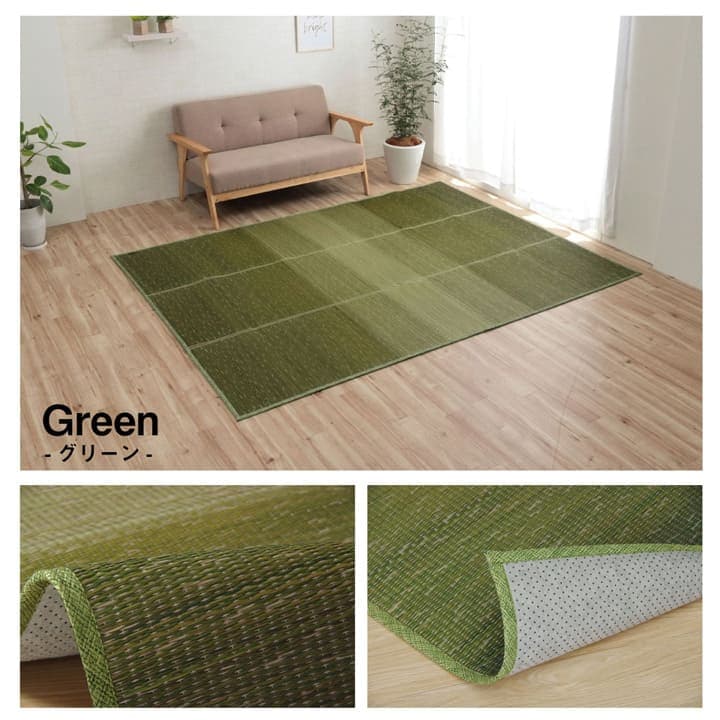 KOBA-GUARDという吹き付け加工をおこなったい草ラグです。KOBA-GUARD加工により制菌・抗菌防臭があります。グラデーションカラーでお部屋の彩と清潔感をプラスしてくれます。裏は滑り止め不織布付きで床を傷つけません。