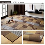 いろいろな織りを組み合わせたパッチワーク風のい草カーペットです。織り方によって違う複数の肌感触をお楽しみ頂けます。落ち着いた色目でモダンな雰囲気に仕上げました。国産(九州産)のい草を使用しています。一本一本が太く、表皮が厚く繊維がキメ細かいので弾力性があり、耐久性に優れています。い草には空気の自然浄化作用、湿度の調節作用などがあります。また汚れにくく、使用するうちに黄金色に変化し味が出ます。い草に青森ヒバ加工を施しています。(抗菌、防臭効果)