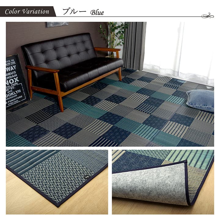 いろいろな織りを組み合わせたパッチワーク風のい草カーペットです。織り方によって違う複数の肌感触をお楽しみ頂けます。落ち着いた色目でモダンな雰囲気に仕上げました。国産(九州産)のい草を使用しています。一本一本が太く、表皮が厚く繊維がキメ細かいので弾力性があり、耐久性に優れています。い草には空気の自然浄化作用、湿度の調節作用などがあります。また汚れにくく、使用するうちに黄金色に変化し味が出ます。い草に青森ヒバ加工を施しています。(抗菌、防臭効果)裏にはフローリングを傷つけにくいよう不織布を貼っています。