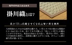 掛川織は九州筑後地方の伝統的な織り方です。大きな目と小さな目に交互に織り込んだ美しく洗練されたモダンなデザインが人気です。また、厳選された良質の太く長いイ草を高密度に織り込んでいますので丈夫で耐久性があり、しかも素足に心地よいクッション性とボリューム感があります。国産(九州産)のい草を使用しています。一本一本が太く、表皮が厚く繊維がキメ細かいので弾力性があり、耐久性に優れています。い草には空気の自然浄化作用、湿度の調節作用などがあります。また汚れにくく、使用するうちに黄金色に変化し味が出ます。い草に青森ヒバ加工を施しています。(抗菌、防臭効果)