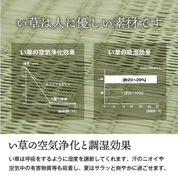 珍しい格子柄タイプの無地の上敷きです。上敷きを敷くだけで畳のお部屋をリフレッシュ出来ます。日焼けしてしまった畳のリフレッシュに、新品の畳を汚さないためのカバーにご使用下さい。長さ110〜115cmの国産(九州産)い草を使用しています。そのうち約91cmを使用しています。ヘリ際はある程度白みを帯びます。(日焼けではありません、い草の根元と先端部分の色です。)い草は長いものほど高級になります。い草は先端部分が赤茶色く、根元が白く真中が青(緑)色です。真中の良質な青の部分を多く使用するほど、丈夫で綺麗な仕上がりとなります。またイ草は使用するうちに日焼けをしますが、真中の青の部分を多く使用したものほど、全体が綺麗にムラなく日焼けし、味が出ます。国産(九州産)のい草を使用しています。国産い草は一本一本が太く、表皮が厚く繊維がキメ細かいので弾力性があり、耐久性に優れています。い草には空気の清浄化作用、湿度の調節作用があり、汚れにくいといった特徴があります。い草に青森ヒバ加工を施しています。(抗菌、防臭効果)表裏の両面が使えて経済的です。