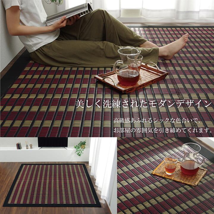 06年福岡県花莚品評会最優秀賞を受賞しました。掛川織は九州筑後地方の伝統的な織り方です。大きな目と小さな目に交互に織り込んだ美しく洗練されたモダンなデザインが人気です。また、厳選された良質の太く長いイ草を高密度に織り込んでいますので丈夫で耐久性があり、しかも素足に心地よいクッション性とボリューム感があります。国産(九州産)のい草を使用しています。一本一本が太く、表皮が厚く繊維がキメ細かいので弾力性があり、耐久性に優れています。い草には空気の自然浄化作用、湿度の調節作用などがあります。また汚れにくく、使用するうちに黄金色に変化し味が出ます。い草に青森ヒバ加工を施しています。(抗菌、防臭効果)