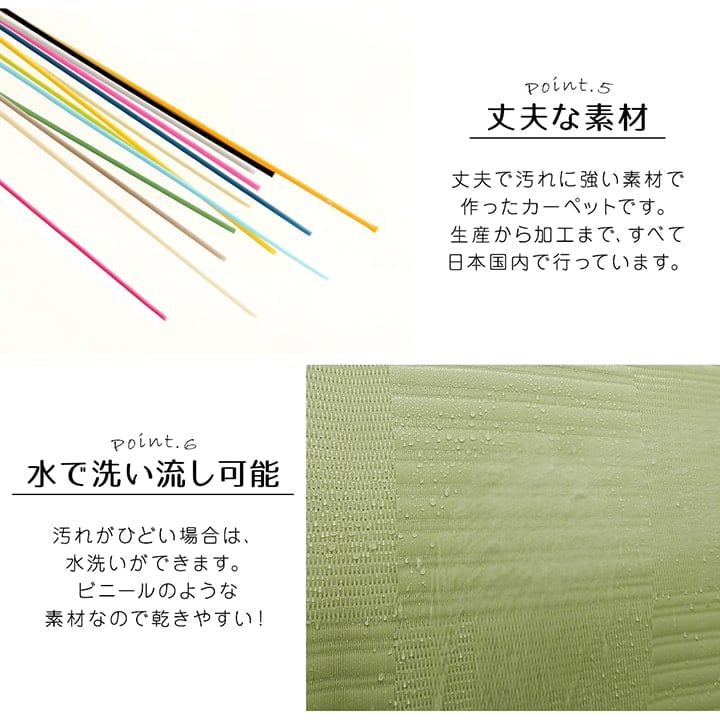 抗菌・防臭効果、消臭効果があるため小さいお子様やペットがいるご家庭でも安心して使用でる日本製の丈夫なカーペットです。水洗いが可能なのでアウトドアでも活躍。水や汚れが浸透しにくいので、汚れても拭くだけの簡単お手入れ。ダニが発生しにくい素材です。