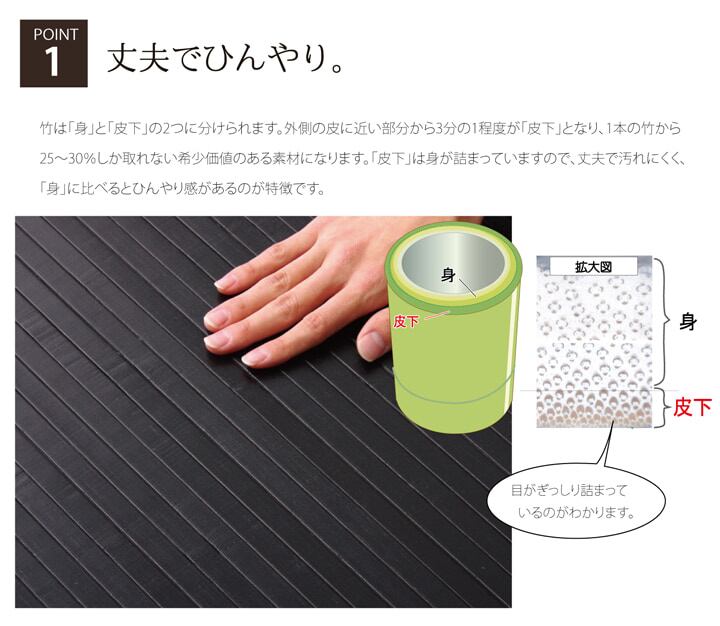 竹は耐久性に優れ、熱伝導率が高いため自然のひんやり感があります。表面の肌触りを滑らかにするため、また竹の色を揃えるためにUV塗装を施しています。シンプルな糸無しの張り付けタイプです。また無垢材を使用し、あたたかみのある質感に仕上げました。素材は17mm幅の竹ヒゴを使用しています。17mm幅の竹ヒゴは大きく育った竹からしか取れない素材です。竹は他の木材と比べると格段に成長が早く(3〜5年で成竹)、持続的生産が可能な環境に優しいサスティナブルな素材です。