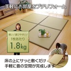 届いたユニット畳を床に置くだけで和のスペースが出来上がります。表地にはポリプロピレンを細いパイプ状にして織込んだ生地を使用しています。強度が高くしっかりとしていて、汚れても表面を水拭きできるので、いつでも清潔にご使用頂けます。お子様の部屋に、ペットのいるご家庭に最適な商品です。中材には弾力性にこだわり15mm厚の硬わたを使用しました。硬綿には青森ヒバ加工を施しています。青森ヒバに含まれるヒノキチオールは天然の物質としてきわめて抗菌力が強い成分です(抗菌、防臭効果)。また軽量タイプなので、持ち運び、設置、片づけなども楽にできます。連結用ジョイントを使用すれば、お部屋に合わせて簡単に何枚でもつなげることが出来ます。