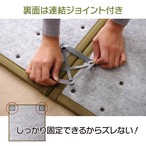 届いたユニット畳を床に置くだけで和のスペースが出来上がります。表地にはポリプロピレンを細いパイプ状にして織込んだ生地を使用しています。強度が高くしっかりとしていて、汚れても表面を水拭きできるので、いつでも清潔にご使用頂けます。お子様の部屋に、ペットのいるご家庭に最適な商品です。中材には弾力性にこだわり15mm厚の硬わたを使用しました。硬綿には青森ヒバ加工を施しています。青森ヒバに含まれるヒノキチオールは天然の物質としてきわめて抗菌力が強い成分です(抗菌、防臭効果)。また軽量タイプなので、持ち運び、設置、片づけなども楽にできます。連結用ジョイントを使用すれば、お部屋に合わせて簡単に何枚でもつなげることが出来ます。