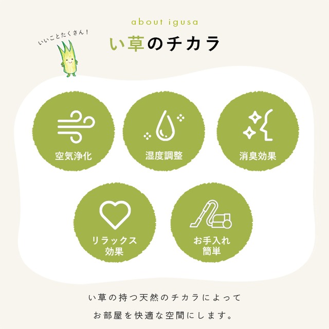 い草には空気の自然浄化作用、湿度の調節作用などがあります。また汚れにくく、使用するうちに黄金色に変化し、味が出ます。