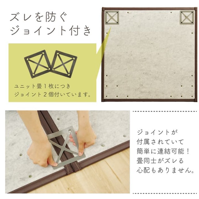 届いたユニット畳を床に置くだけで和のスペースが出来上がります。表生地には国産(九州産)のい草を使用しています。一本一本が太く、表皮が厚く、繊維がキメ細かいので弾力性があり、耐久性に優れています。い草には空気の自然浄化作用、湿度の調節作用などがあります。また汚れにくく、使用するうちに黄金色に変化し、味が出ます。中材には弾力性にこだわり15mm厚の硬綿を使用しました。硬綿にはヒバエッセンス加工を施しています。青森ヒバに含まれるヒノキチオールは天然の物質としてきわめて抗菌力が強い成分です(抗菌防臭効果)。また軽量タイプなので、持ち運び、設置、片づけなども楽にできます。連結用ジョイントを使用すれば、お部屋に合わせて簡単に何枚でもつなげることが出来ます。