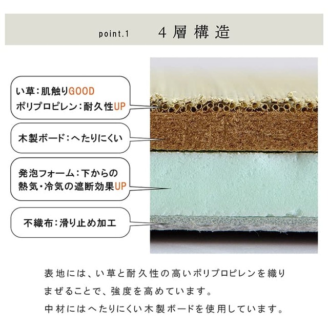 い草には空気の自然浄化作用、湿度の調節作用などがあります。また汚れにくく、使用するうちに黄金色に変化し味が出ます。