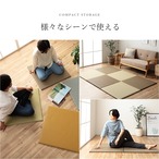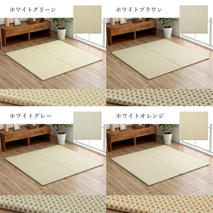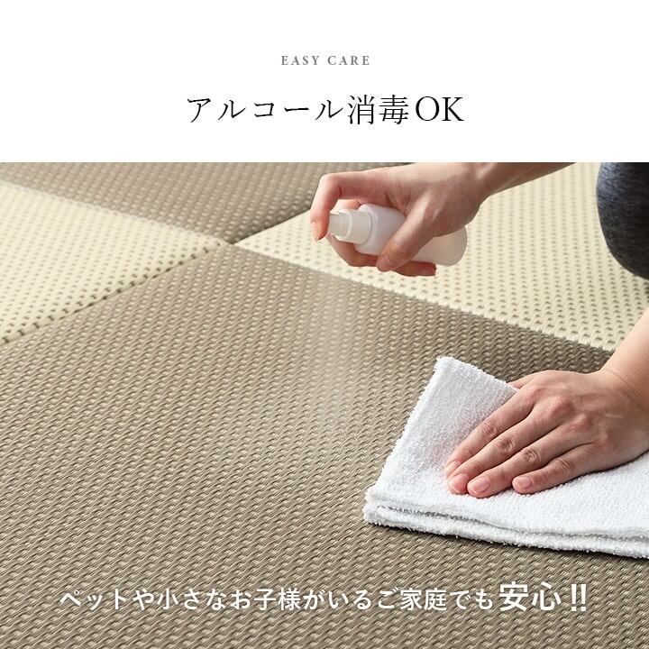 お部屋の雰囲気や使用シーンに合わせて組み合わせ自由自在な置き畳です。フローリングに置くだけでくつろぎのスペースに。 表地にはポリプロピレンを細いパイプ状にして織込んだ生地を使用しています。強度が高くしっかりとしています。 汚れても表面を水拭きでき、一般的な除菌スプレーで拭いても色落ちせず、清潔な状態を保つことができます。 中材にウレタンチップを使用しているので、ほどよいクッション性があります。 裏地にはすべり止め付きの不織布を使用。ズレにくいのもうれしいポイントです。 リビングやお子様の部屋、ペットがいるご家庭にもおすすめ。