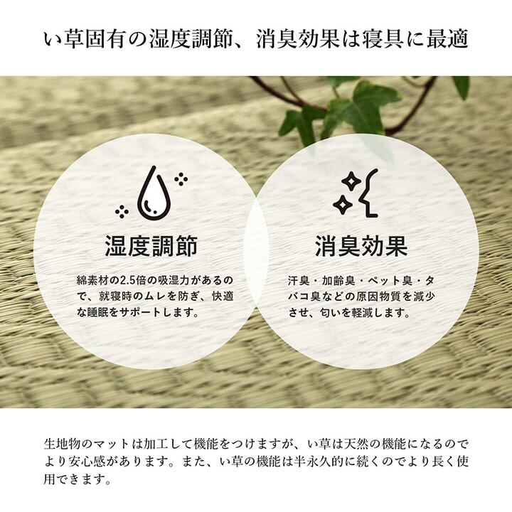 い草には湿度調整、消臭効果があり、寝具には最適な素材です。生地物とは違い、天然の機能になるので、より安心感があります。この天然の機能は半永久的に続くので、長い間お使い頂けます。