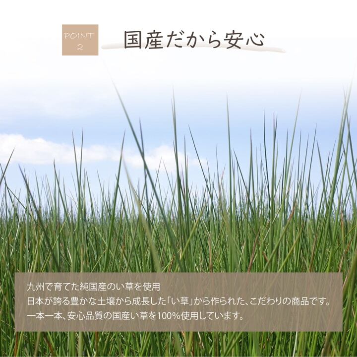 国産イ草100%の消臭剤です。イ草の良さをもっと多くの人に知ってもらいたいという想いから「デオグラス」は誕生しました。イ草の効能の一つである消臭効果を活用し、お車やお部屋でご使用頂けるコンパクトサイズに仕上げました。本品は日本国内で栽培、育成、収穫された天然イ草を使用しいています。使用シーンは様々、リビング、玄関、トイレ、車(ヘッドレスト、ドリンクホルダー、シートの下)など、その他いろいろな場所で活躍します。長さをカットしてコースターやランチョンマットが自作できます。その際はカット箇所をボンドなどで留めて下さい。※箱のデザインはイメージです。予告なくデザインが変更になる場合があります。ご了承下さい。