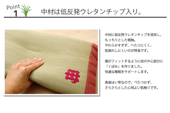 国産のイ草を使用したイ草枕です。より頭にフィットするよう、枕の中心部分に「くぼみ」をつくりました。快眠い草の効能として1.綿の約2.5倍の吸湿力 2.蒸れにくい。汗による湿気を吸うことにより温度を下げ快適な就寝を促します。 3.汗のにおいを軽減。汗のにおいの元となる化学物質を90%以上抑えます。などがあります。国産(九州産)のしなやかなイ草を使用していますので、柔らかく、すべすべしたとした肌触りです。中材には低反発ウレタンチップを使用しています。柔らかすぎずヘタリにくく、型崩れしにくいのが特長です。い草の表面に天然青森ヒバ加工を施しています(抗菌・防臭効果)。青森県のヒバの木から抽出した「ヒバ油」をメーカー独自の技術で材料や商品に加工しました。「ヒバ油」には、ヒノキチオールという天然物質としては極めて抗菌性の高い成分が含まれ、医療や食品など多分野で利用研究が進められています。