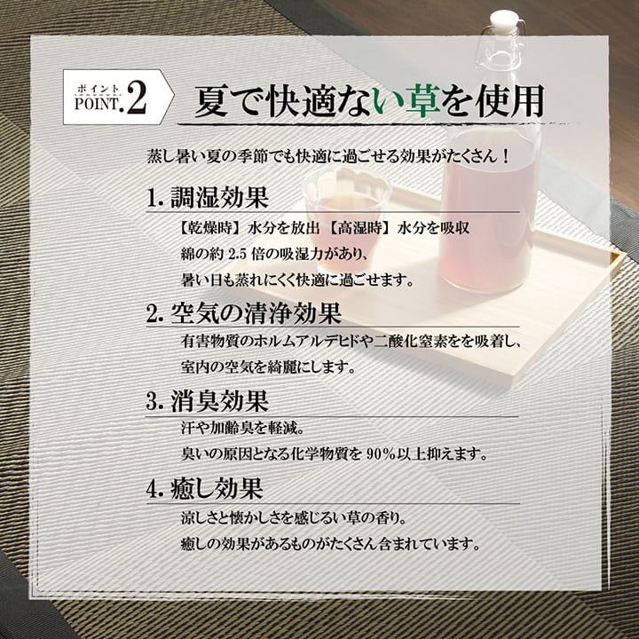 国産い草を使用したシンプルな格子柄のごろ寝フリーマットです。お仕事のちょっとした休憩時間の仮眠にも最適です。い草には1.綿の約2.5倍の吸湿性があり汗のじめじめを軽減します。2.湿度の調整作用があり、蒸れにくく快適な就寝を促します。3.汗のにおいの元となる化学物質を90%以上抑え、においを軽減します。などの効果があります。中材にはクッション性にこだわり固わた40mmを使用していますので程良い弾力性があり、フローリングでも快適にご使用頂けます。イ草表面にヒバエッセンス加工を施しています(抗菌・防臭効果)。青森県のヒバの木から抽出した「ヒバ油」をメーカー独自の技術で材料や商品に加工しました。「ヒバ油」には、ヒノキチオールという天然物質としては極めて抗菌性の高い成分が含まれ、医療や食品など多分野で利用研究が進められています。