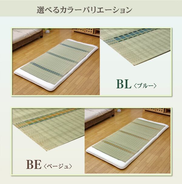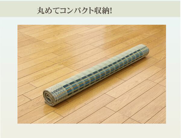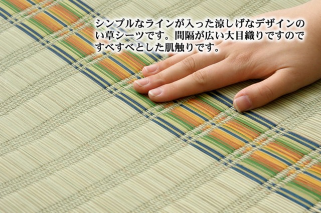 国産(九州産)のい草を使用したネゴザ(寝ござ)です。一本一本が太く、表皮が厚く繊維がキメ細かいので、弾力性があり、耐久性に優れています。い草には1.綿の約3倍の吸湿性があり汗のじめじめを軽減します。2.湿度の調整作用があり、蒸れにくく快適な就寝を促します。3.汗のにおいの元となる化学物質を90%以上抑え、においを軽減します。などの効果があります。目が大きく、すべすべとして肌触りの良い大目織りです。青森ヒバ加工を施しています。(抗菌・防臭効果)