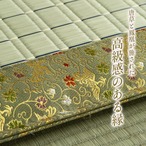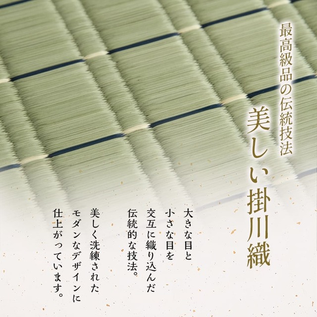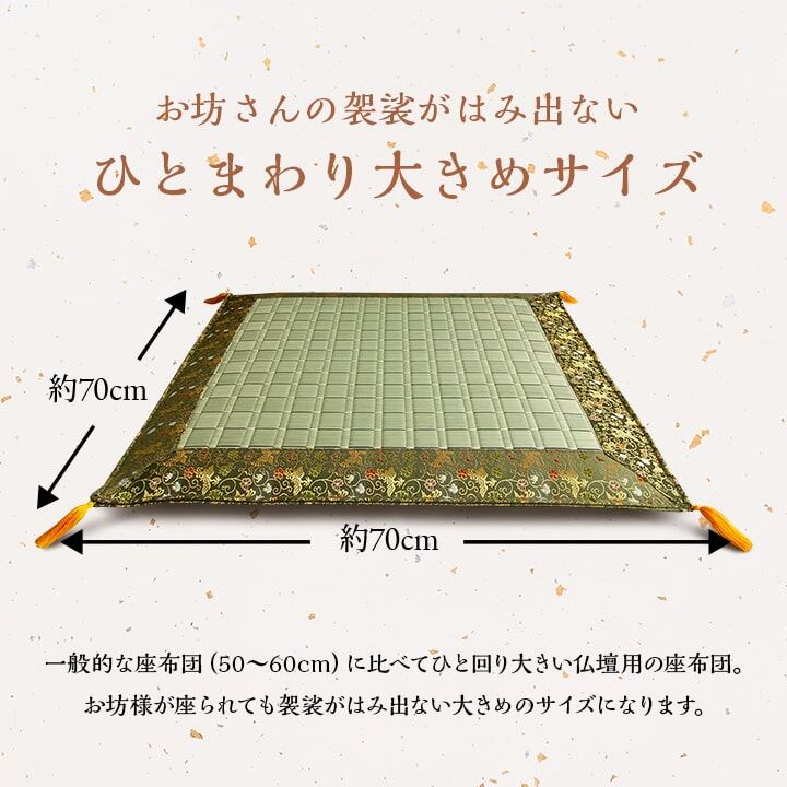 お盆の準備や、新しくご仏壇をご購入された方にお勧めの御前座布団です。側地は掛川織りという技法で仕上げました。掛川織りは九州地方の伝統的な織り方です。大きな目と小さな目に交互に織込んだ美しく洗練されたモダンなデザインが人気です。また厳選された良質の太く長いイ草を高密度に織込んでいますので丈夫で耐久性があり、しかも素足に心地よいクッション性とボリューム感があります。い草には空気の自然浄化作用、湿度の調節作用などがあります。また汚れにくく、使用するうちに黄金色に変化し味が出ます。い草にヒバエッセンス加工を施しています(抗菌防臭効果)。中材にはポリエステルわたを凝縮して仕上げた、固わたを40mm使用しています。程良い弾力性があり、ヘタリにくいのが特徴です。