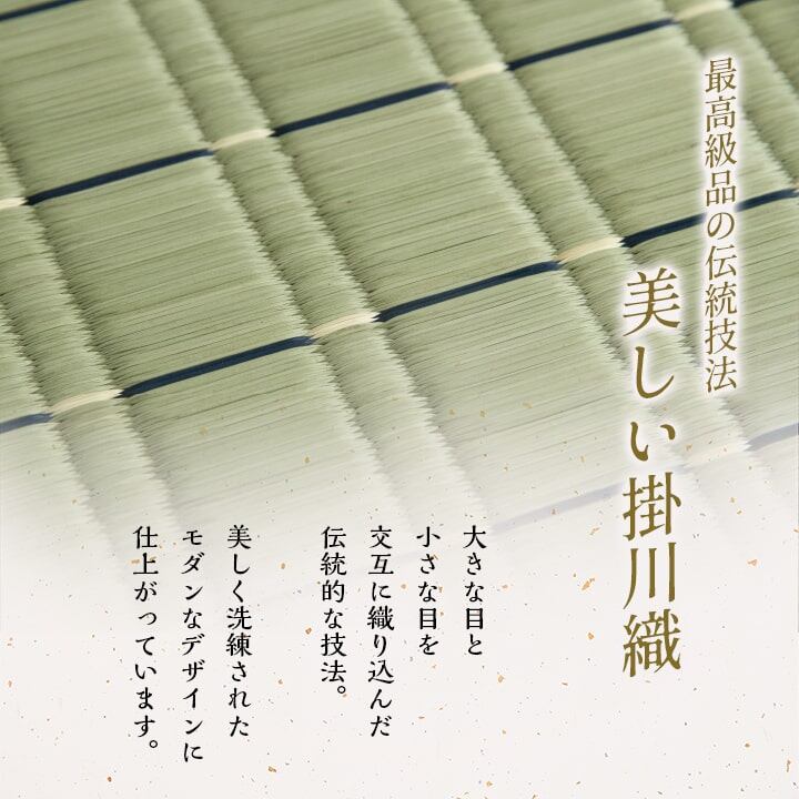 お盆の準備や、新しくご仏壇をご購入された方にお勧めの御前ござです。側地は掛川織りという技法で仕上げました。掛川織りは九州地方の伝統的な織り方です。大きな目と小さな目に交互に織込んだ美しく洗練されたモダンなデザインが人気です。また厳選された良質の太く長いイ草を高密度に織込んでいますので丈夫で耐久性があり、しかも素足に心地よいクッション性とボリューム感があります。い草には空気の自然浄化作用、湿度の調節作用などがあります。また汚れにくく、使用するうちに黄金色に変化し味が出ます。い草にヒバエッセンス加工を施しています(抗菌防臭効果)。