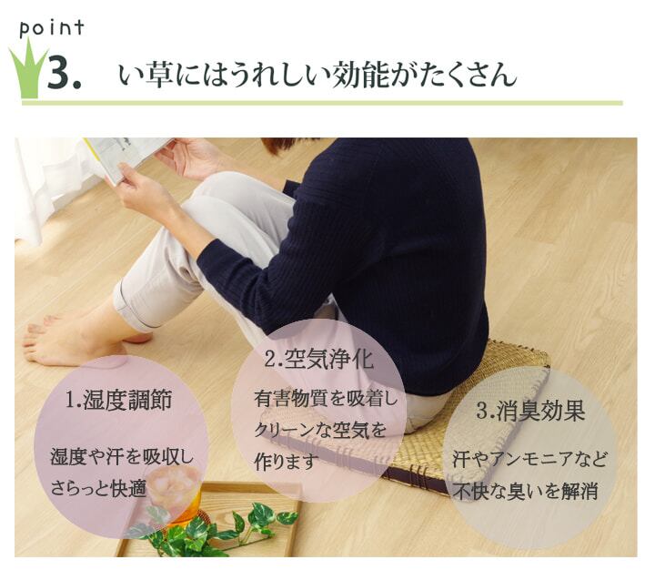 ベトナムの太陽の下で元気に育った七島イ草を使用しています。七島イ草はベトナムでとれる草の一種で、日本のイ草によく似た効能を持ち合わせています。特長として1.空気の清浄力(空気汚染の原因や人間の健康に悪影響を及ぼしているホルムアルデヒド、二酸化窒素を吸収します。)2.耐久性があります。肌触りは自然素材ならではの「ざっくり感」、座り心地は「ふんわり」です。中材にはウレタンを使用していますので不思議な快適さを感じることができます。置くだけで雰囲気の出る七島イ草は家のリビングに、お店(居酒屋、和風の飲食店など)に、簡単にイメージ通りの空間にするお手伝いをしてくれます。一つ一つ丁寧に編み込んでいますので、しっかりしていて丈夫です。※自然素材であること、また職人が一つ一つ手作業にて加工を行うため、形状のバラつきや表示サイズと多少異なることがあります。ご了承下さい。