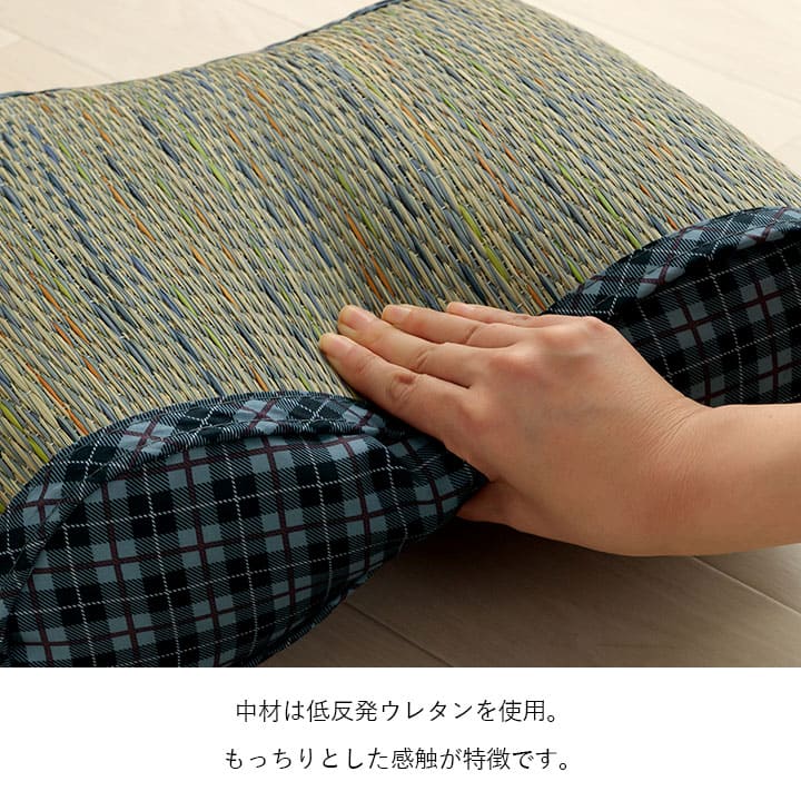 チェック柄のおしゃれない草のフィットクッション。腰当てやお昼寝用の枕、足枕など、いろんな使い方が出来ます。