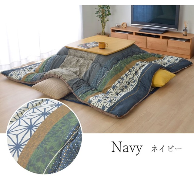 やわらかな肌触りのピーチスキン加工を使用したこたつ布団です。優しい肌触りが特徴です。裏地にはあたたかく、ふんわりとなめらなタッチ感のフランネルを使用しています。部分暖房のこたつは電気代もお得です。