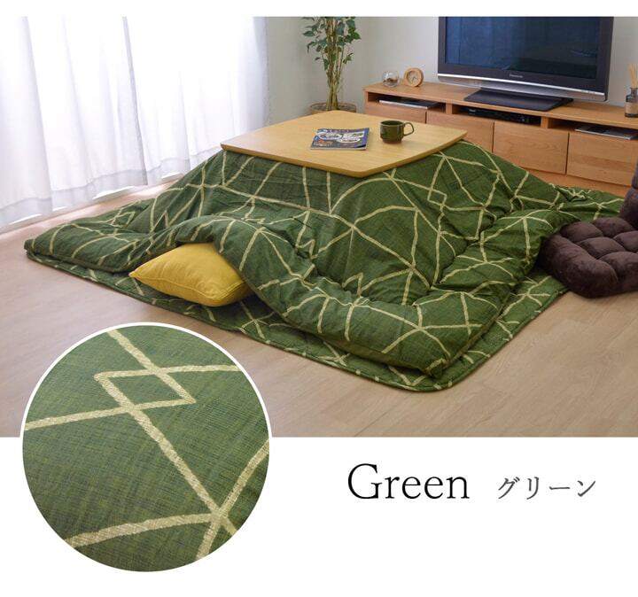 幾何柄のこたつ布団です。国内でわた入れをしています。側地にはポリエステル素材を起毛させた柔らかい生地を使用しています。部分暖房のこたつは電気代もおトクです。