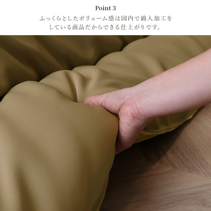 ふっくらとしたボリューム感は国内で綿入加工をしている商品だからできる仕上がりです。