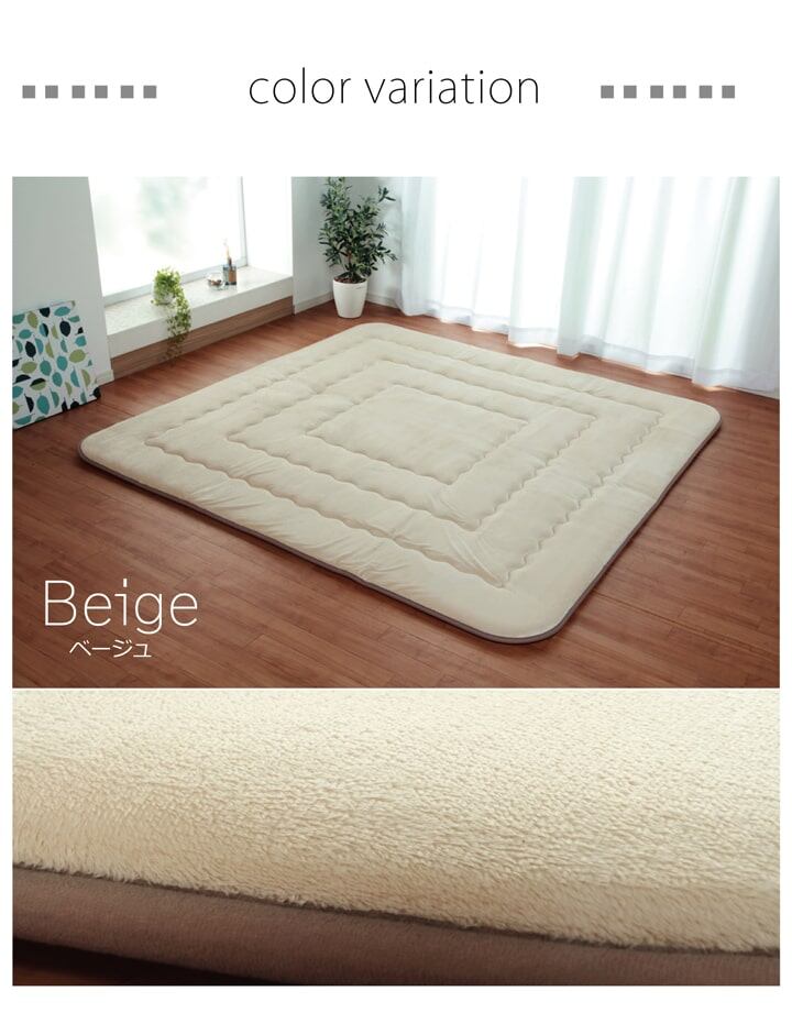 表地には肌触りが良く、耐久性に優れたマイクロファイバーを使用しています。中材にはクッション性にこだわった国産の固綿40mmを使用しています。十分な弾力性があるのでフローリングでのご使用にも最適です。遮音特級LL-30を取得しています。床下への騒音も軽減します。また、こたつと併用するとこたつの熱を床下へ逃しにくくなるので省エネ効果もあります。