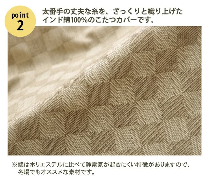 生地にインド綿を使用したこたつカバーです。シンプルモダンをテーマにデザインしておりますので、少し大人で素材感のあるお部屋のイメージにぴったりです。インド産の綿生地を使用しております。また、綿はポリエステルに比べ、冬場気になる静電気も起こりにくく、繊維の中でも特に肌触りがよいのが特徴です。