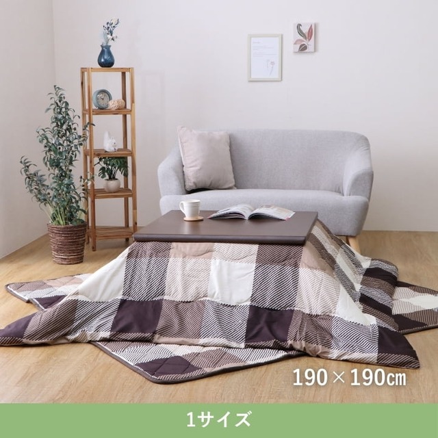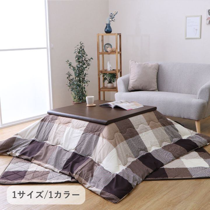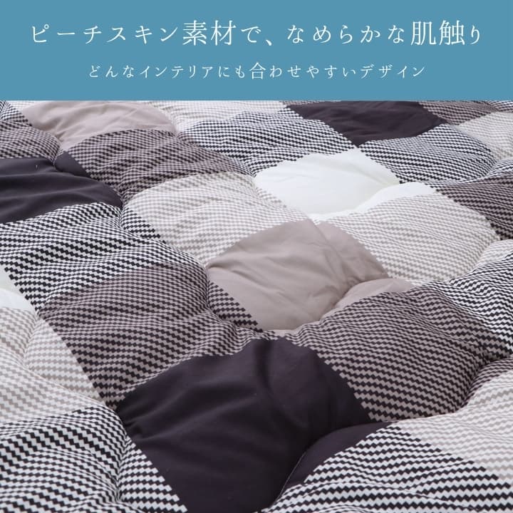 ピーチスキン生地のチェック柄デザインで、柔らかな肌触りが特徴。こたつ掛けと敷きのセットです