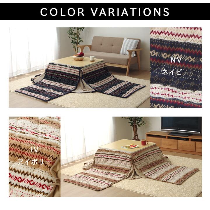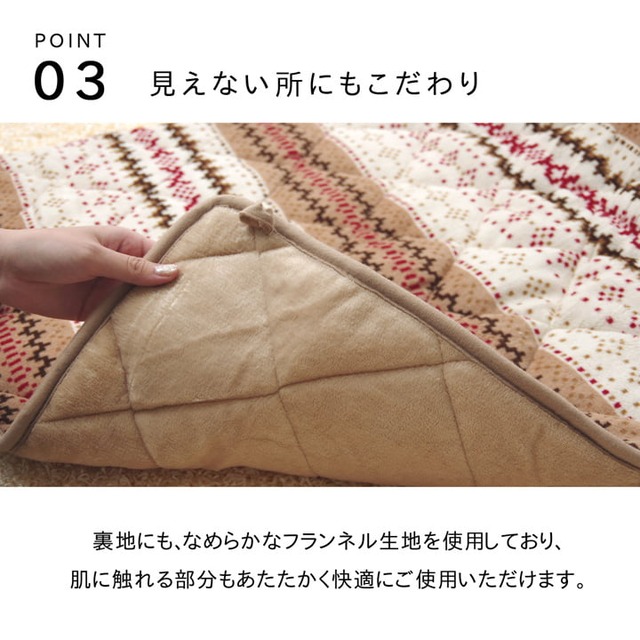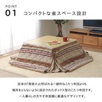 こたつで寝てしまうという方にピッタリのこたつ布団です。タレ部分を長く伸ばして使うこともできるので、横になってゆったりとくつろげます。表地には肌触りのよい、あったか素材の起毛生地を使用しています。裏地にはフランネルと呼ばれる、しっとりなめらかな肌触りのよい生地使用しています。省スペースタイプで四隅を結べば角が膨らまず、お部屋を広く使えます。薄手なので折りたたんでもかさばらず、コンパクトに収納できます。部分暖房のコタツは電気代もおトクです。