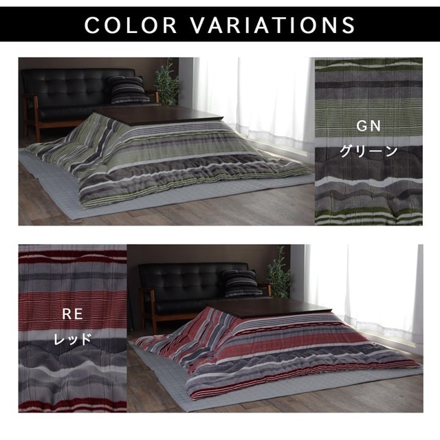 ジャガード織の凹凸感が特徴的な素材感があるこたつ布団です。お部屋の雰囲気気を崩さない淡い色目とカジュアルでお部屋に合いやすいストライプ柄にしました。薄手なので折りたたんでもかさばらず、コンパクトに収納できます。部分暖房のコタツは電気代もおトクです。